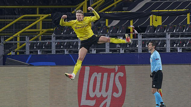 Haaland scored both dortmund goals as a draw sent them through to the champions league final eight.
